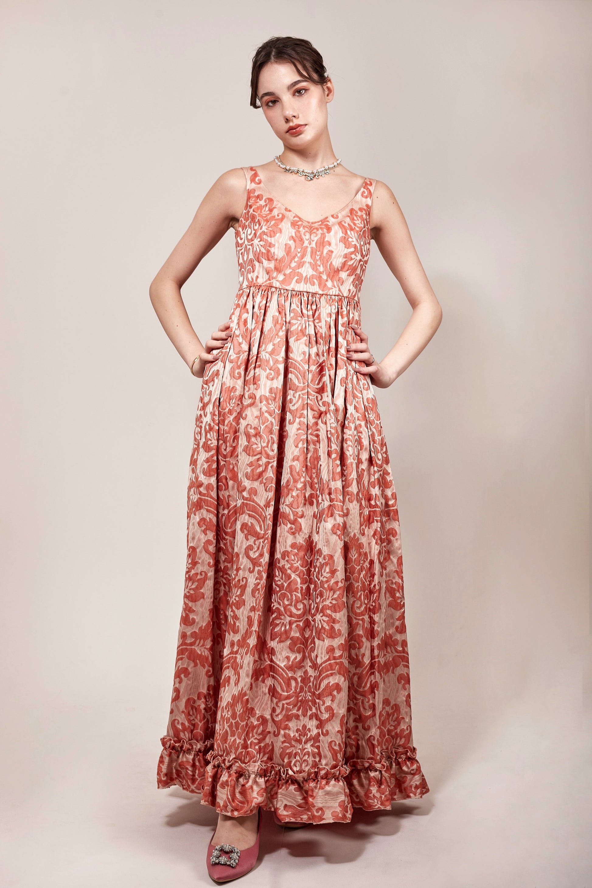 Crafted from luxurious moire damask in a pretty coral shade, this dress is perfect for any special occasion.