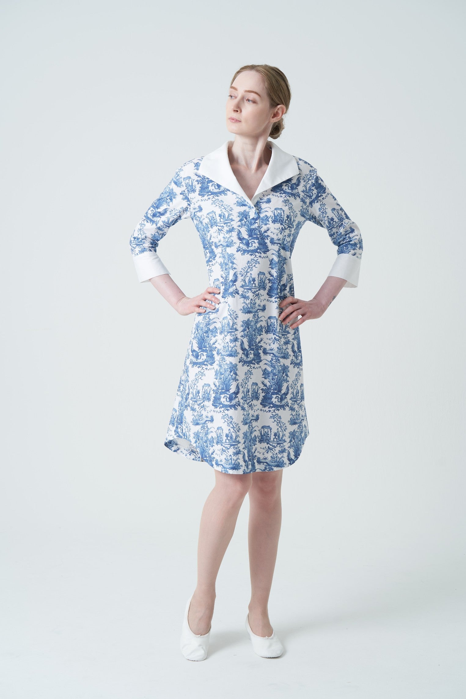 A shirt dress inspired by 18th century French style. Although it is simple, the pleats on the back create a feeling of relaxation and elegance.