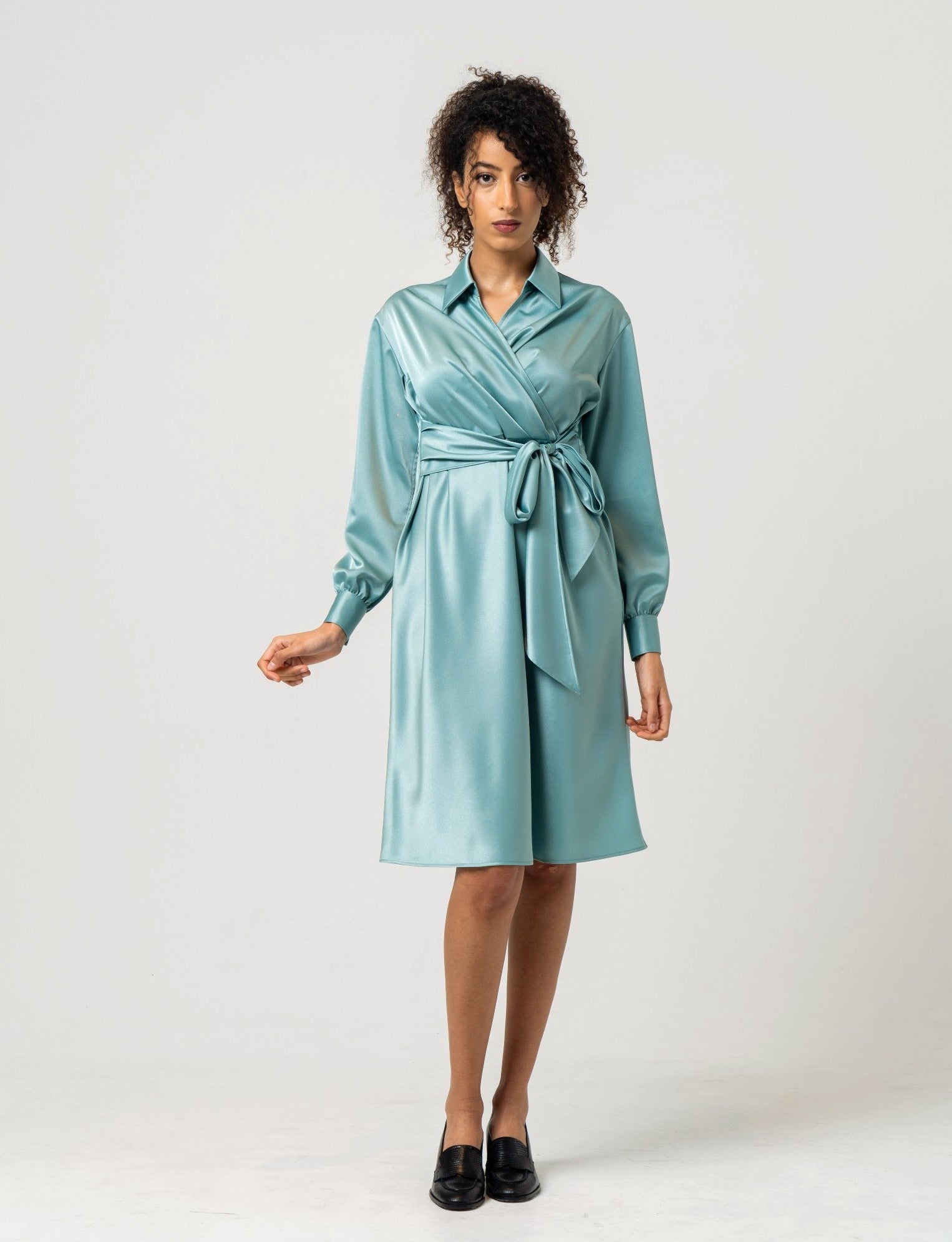 This satin cache-coeur dress features an elegantly wrapped bodice and neat collar, creating a feminine yet handsome style that is suitable for a variety of occasions, from the office to parties.