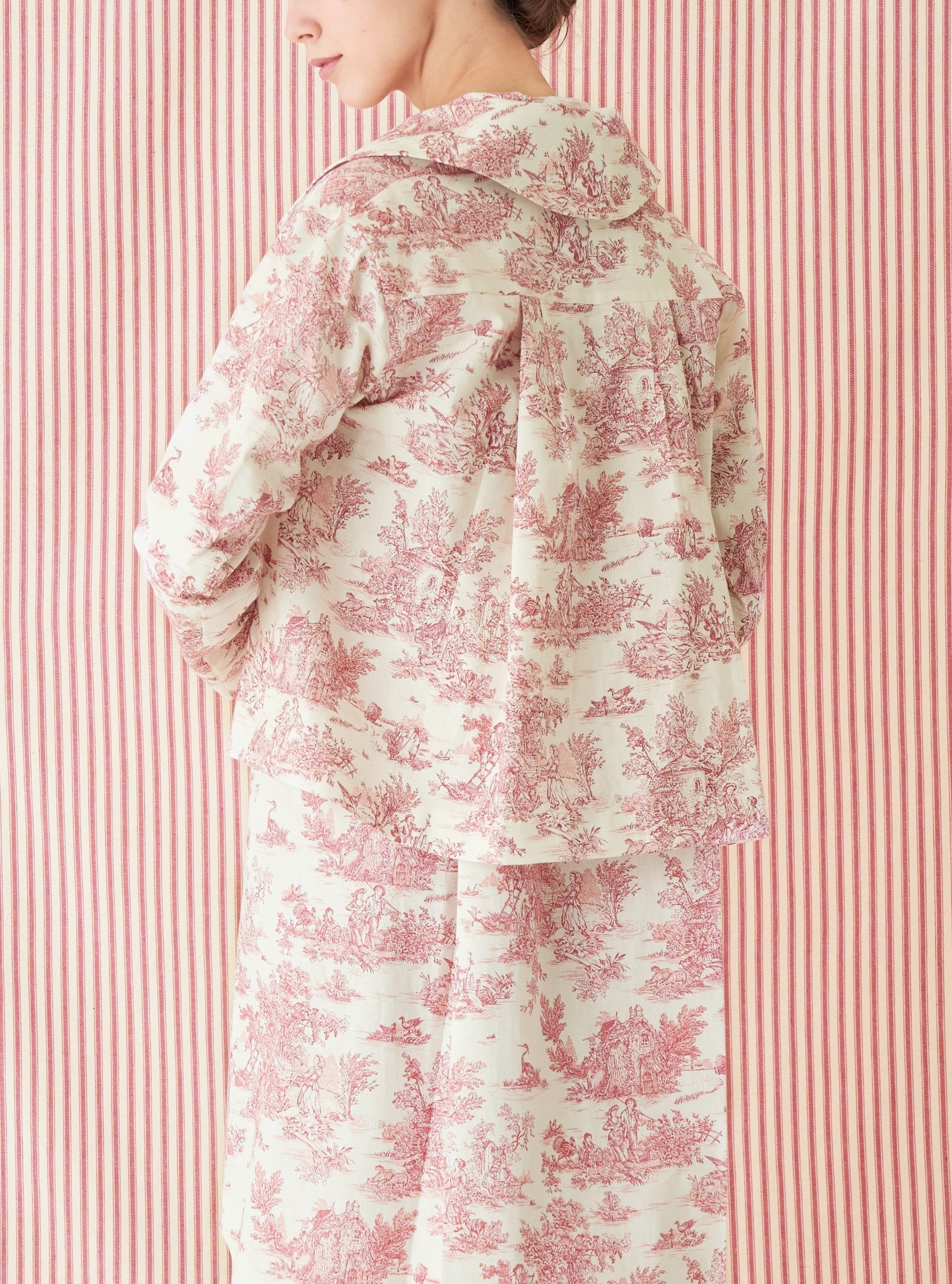 A shirt jacket inspired by 18th century French style. Although it is simple, the large collar and pleats on the back create a relaxed and elegant look.